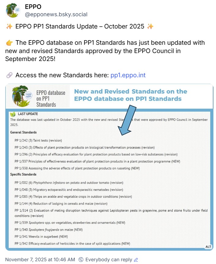 EPPO communicates key updates to member countries through various online platforms as well as official notifications. Our content on online platforms aims to highlight new information that is important to member organisations. This includes pest alerts, diagnostic standards, pest risk analyses, biological control measures, quarantine pest management and more.