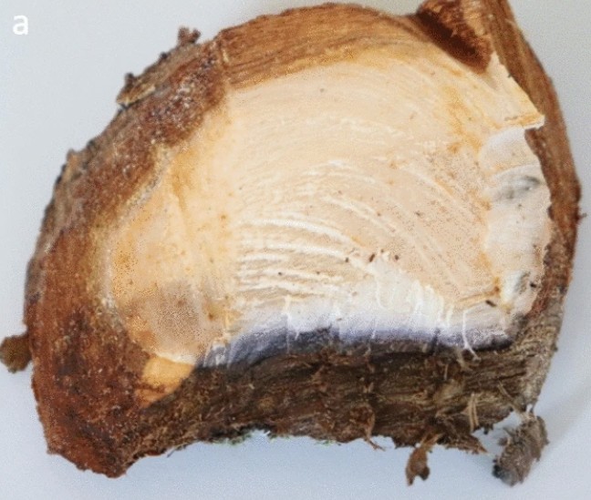 Purple wood discoloration visible on the cross-section of D. bulgarica infected branch